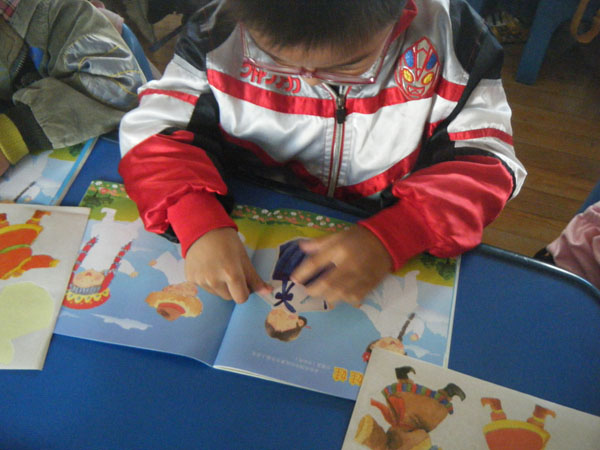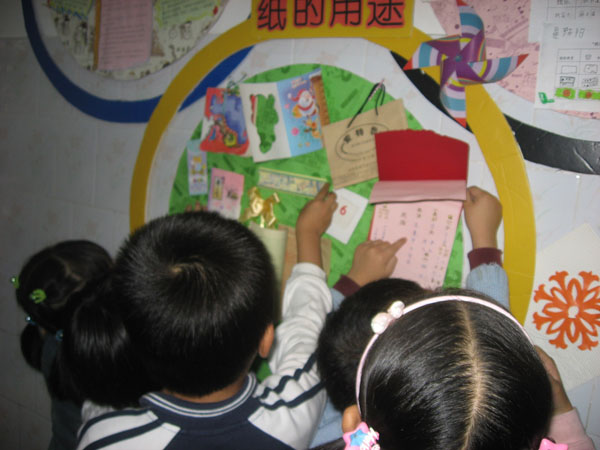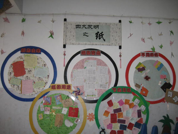 在此活动中,有许多孩子已不满足于哪四大发明,想要更多了解,特别是日常生活中熟悉的纸。因此,我们布置一块主题墙,以小组和个别化形式开展了有关纸的活动。