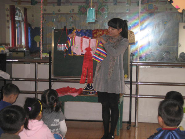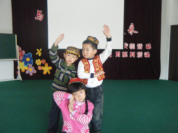 中国是一个多民族的国家,为了让孩子们更多的了解少数民族,我们从服装入手,将孩子们装扮成民族娃娃的形象。通过让孩子们介绍自己和家长共同搜集的资料,请其他小朋友品尝特色食品等活动,让孩子们感受到:中国是一个快乐大家庭,它拥有56个少数民族;葡萄干是新疆的特产;蒙古人住在帐篷里…