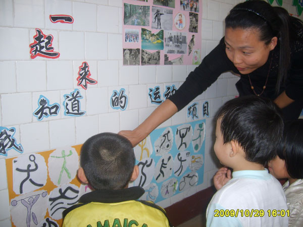 随着去年奥运会的顺利召开,郭晶晶,姚明,刘翔等运动员成了孩子们心中喜欢的对象,知道了射击、游泳、篮球、跳水等许多运动项目,并收集了运动员和比赛项目的图片,我们开展了“知识竞赛”,“游戏比赛”‘等活动,活动中孩子大胆向同伴介绍自己喜欢的运动员,激发了孩子热爱中国运动员的情感,有为国争光的愿望。