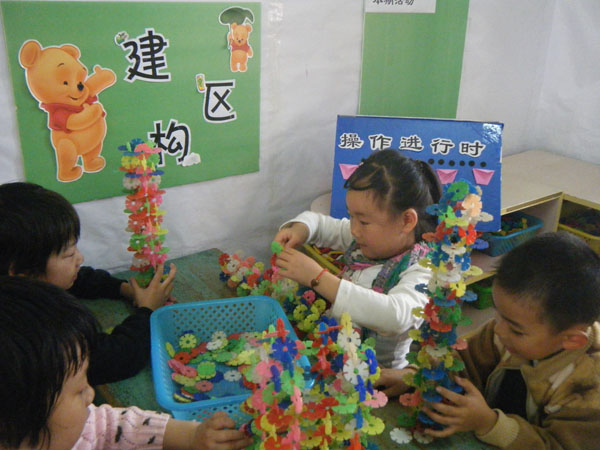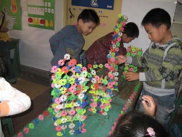 中国地大物博,有着许多的高山,河流和城市。在活动中,孩子们很乐意在地图上寻找他们去过的城市,畅想我们所在的城市—海安将来的发展,并通过插塑想象搭建出了一幢幢高楼大厦。