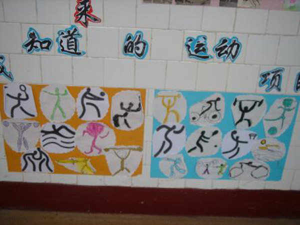 教师们发挥各自所长,群策群力,从幼儿的视角出发,充分利用身边的废旧材料,制作出了以“大家一起来运动”、“我知道的运动项目”等背景板块,将幼儿运动与奥运精神相融合,在充满野趣又不失童趣的氛围中,让幼儿体验运动的快乐与健康。