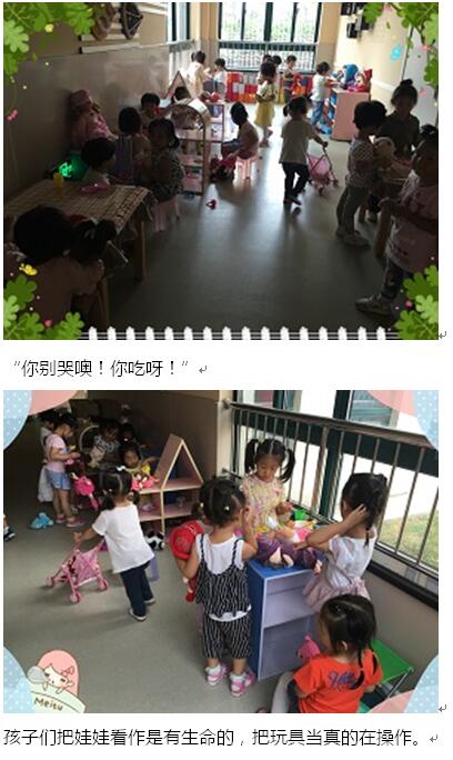 父母是人生的第一启蒙老师。所以,孩子们最先熟知和接触的就是自己的爸爸、妈妈,对角色身份的体验就是从爸爸妈妈开始的。孩子们在游戏中充当爸爸妈妈的角色,很自然地去模仿爸爸妈妈的言谈举止,学习他们的日常行为,将自己理解的爸爸妈妈形象表现出来。娃娃家是小班区域游戏的主旋律,孩子们都非常热衷于此游戏