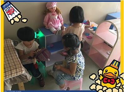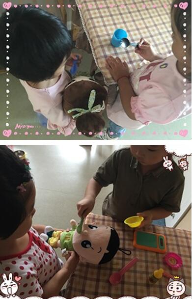 瞧,宝宝们开始游戏了!大家分别选择了担任爸爸、妈妈、奶奶等角色。