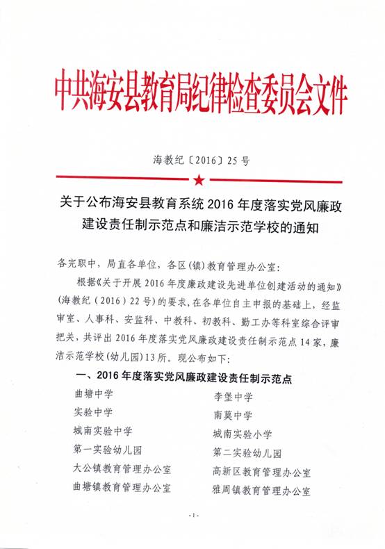 【集体荣誉】关于公布海安县教育系统2016年度落实党风廉政建设责任制示范点和廉洁示范学校的通知 发布时间:2016-12-22 00:00:00 浏览次数: 次 【字体:小 大】 分享到: 【打印正文】