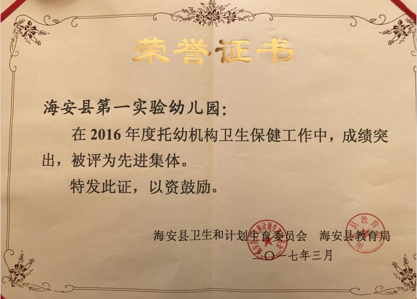 【集体荣誉】我园被评为2016年托幼机构卫生保健先进集体