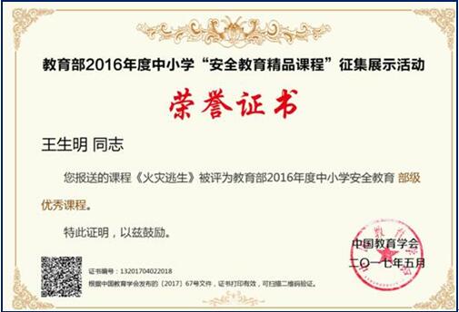 在教育部中小学“安全教育精品课程”征集活动中,王生明老师执教的集体活动《火灾逃生》被评为部级“优秀课程”,这是整个南通地区唯一入选的幼儿园安全教育集体活动,也是幼儿园多年来安全教育结出的丰硕成果。