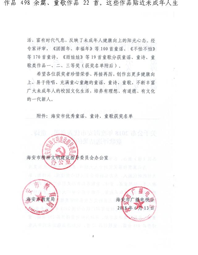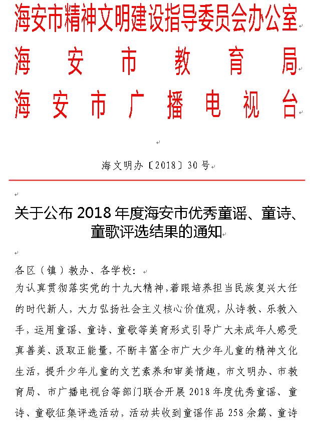海安市优秀童谣、童诗、童歌获奖名单