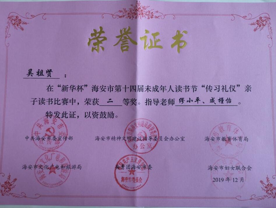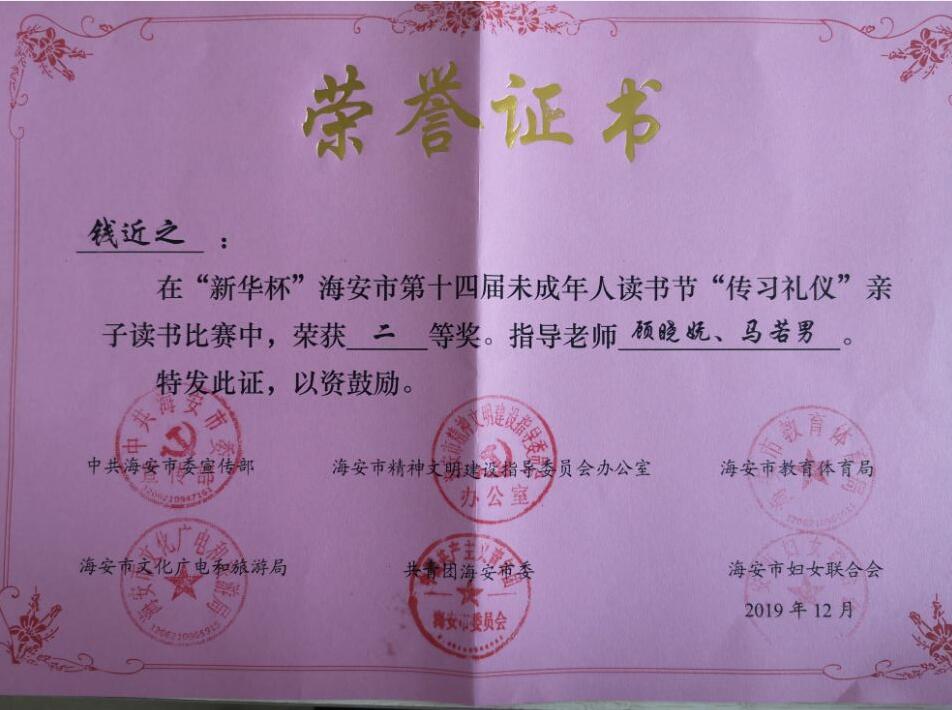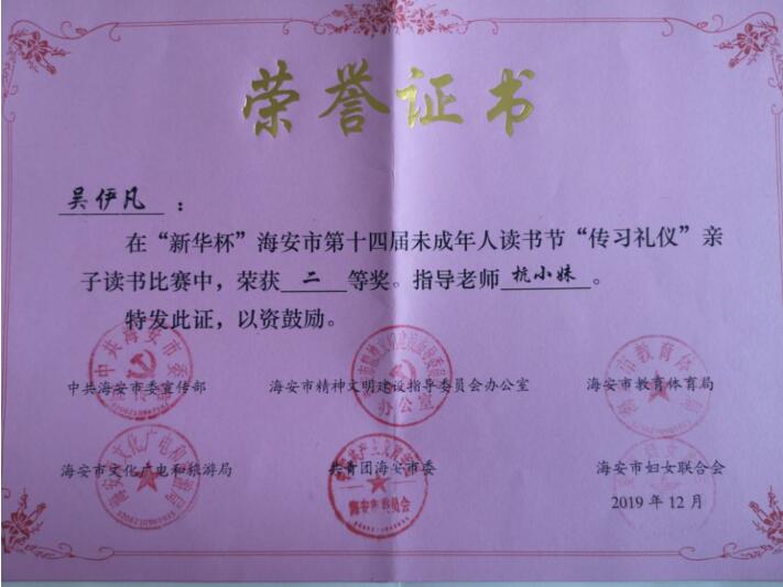 【个人荣誉】我园幼儿在“新华杯”海安市第十四届未成年人读书节“传习礼仪”亲子读书比赛中获二等奖 发布时间:2020-06-24 00:00:00 浏览次数: 次 【字体:小 大】 分享到: 【打印正文】