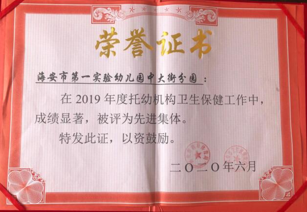 【集体荣誉】我园中大街分园在2019年度托幼卫生保健工作中被评为先进集体