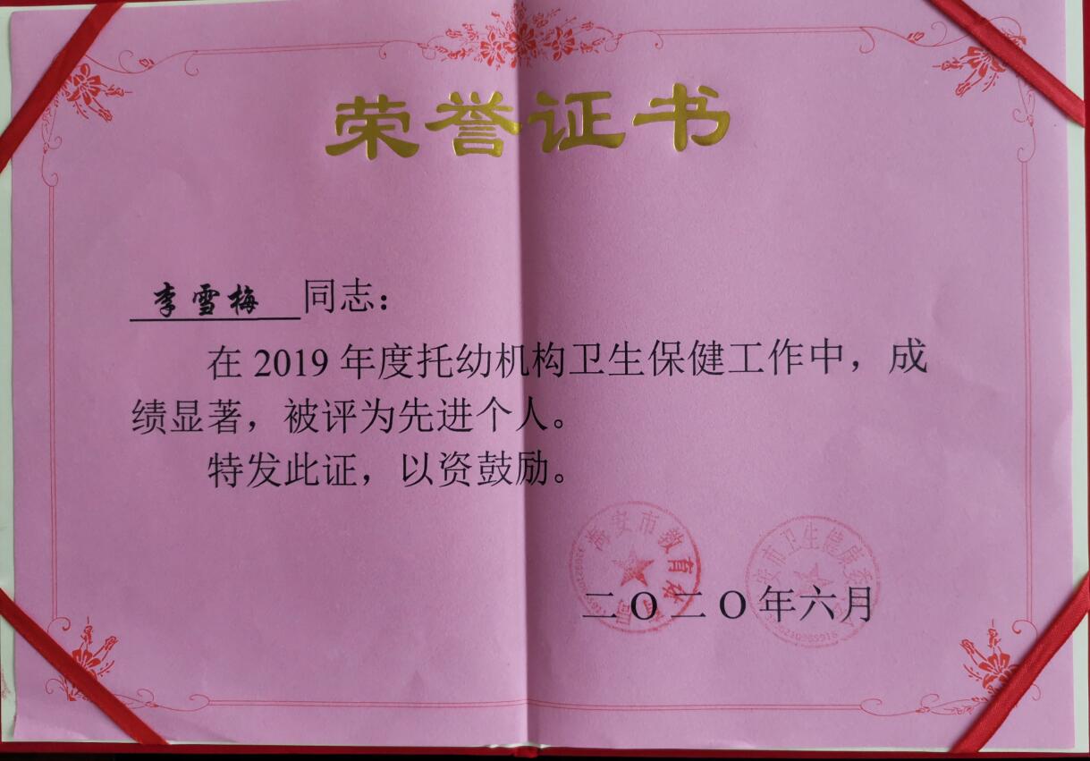 【个人荣誉】我园教师在2019年度托幼机构卫生保健工作中被评先进个人