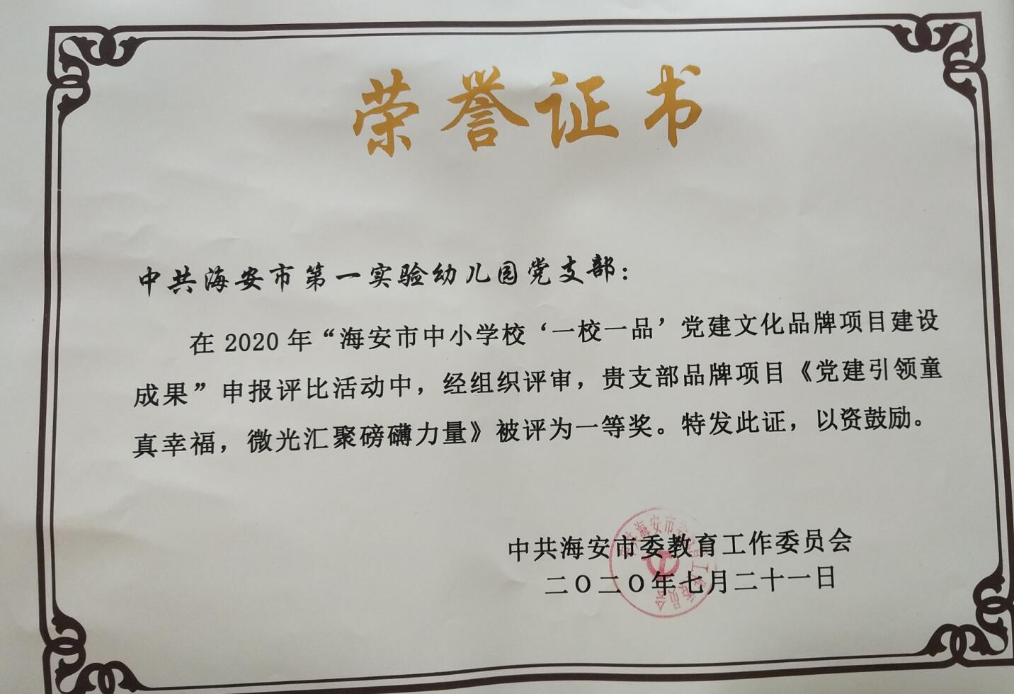 【集体荣誉】在2020年“海安市中小学‘一校一品’党建文化品牌项目建设成果”评比活动中我园荣获一等奖 发布时间:2020-10-19 00:00:00 浏览次数: 次 【字体:小 大】 分享到: 【打印正文】