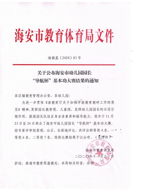 【个人荣誉】我园韩铭在海安市幼儿园园长“导航杯”基本功大赛中荣获特等奖