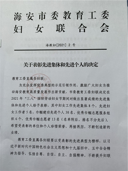 【集体荣誉和个人荣誉】我园大班组获优秀巾帼志愿服务组织,多名教师获市教育工委妇女工作先进个人