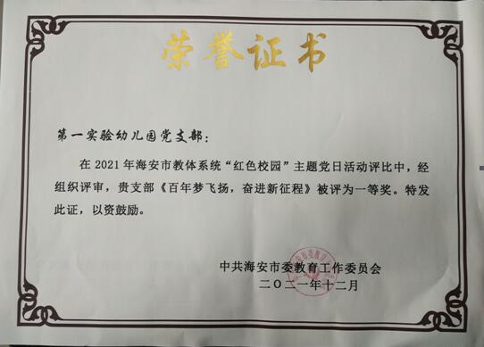【集体荣誉】我园党支部在2021年度“红色校园”主题党日优秀案例评选活动中获一等奖