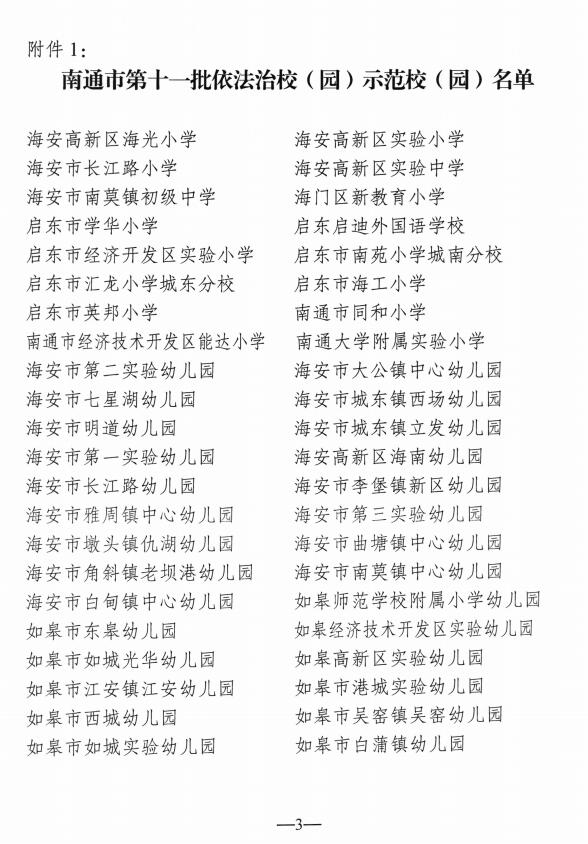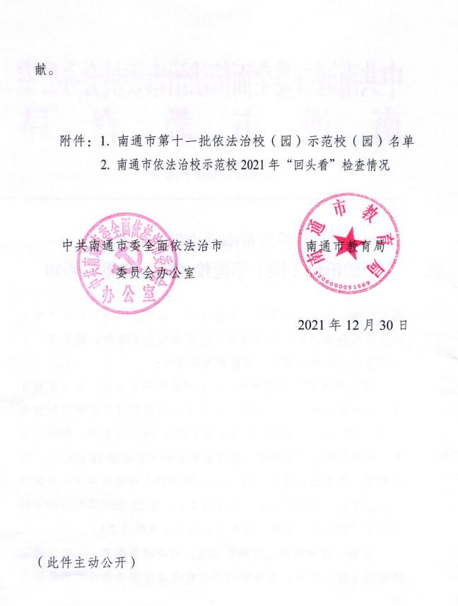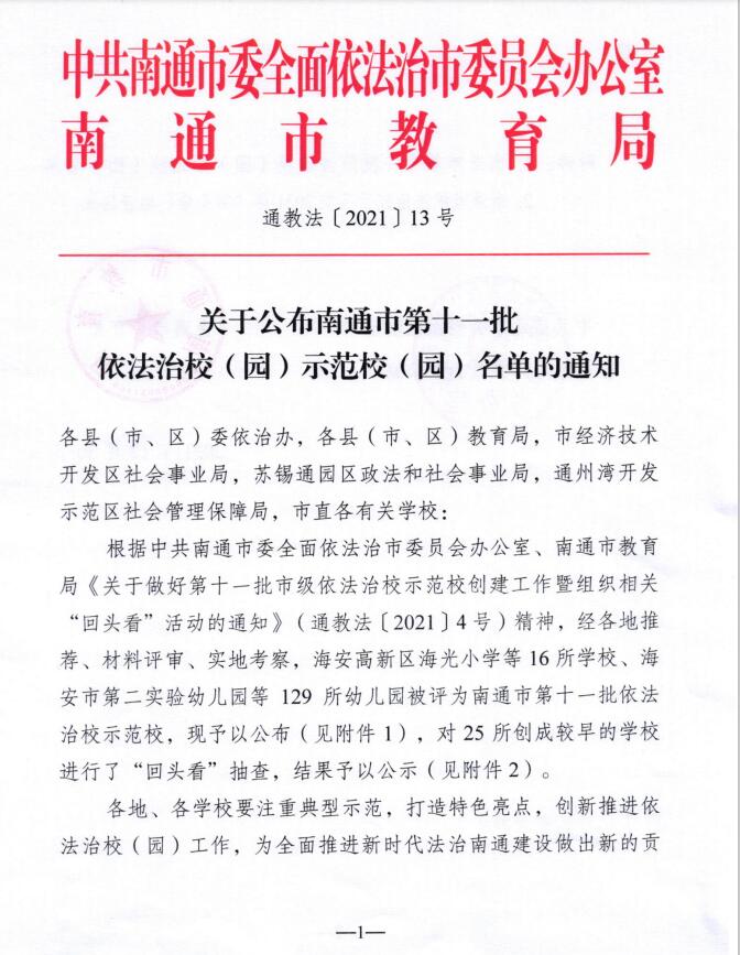 【集体荣誉】我园被评为南通市第十一批依法治校示范校
